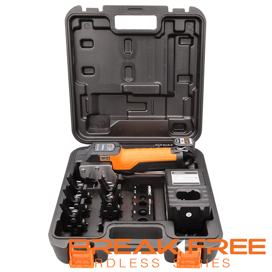 A welcome departure from creating flares manually, the NEF6LM BreakFree® Power Flare yields accurate, hassle-free flares in a fraction of the time compared to traditional flaring methods. Weighing less than 3 pounds, the new Power Flaring Tool equips with a high-performance rechargeable lithium battery which makes over 100 flares per charge. NAVAC’s second-generation automatic flaring solution is significantly reduced in weight and price without sacrificing accuracy or consistency. Designed to perform reliably in harsh environments, the NEF6LM BreakFree® Power Flare also allows one-button, one-hand operation. In addition, it features a battery power indicator and a flashlight It comes in a sturdy blow-molded case with five commonly-sized flare dies, one battery, a charger, and a premium flare gauge.
