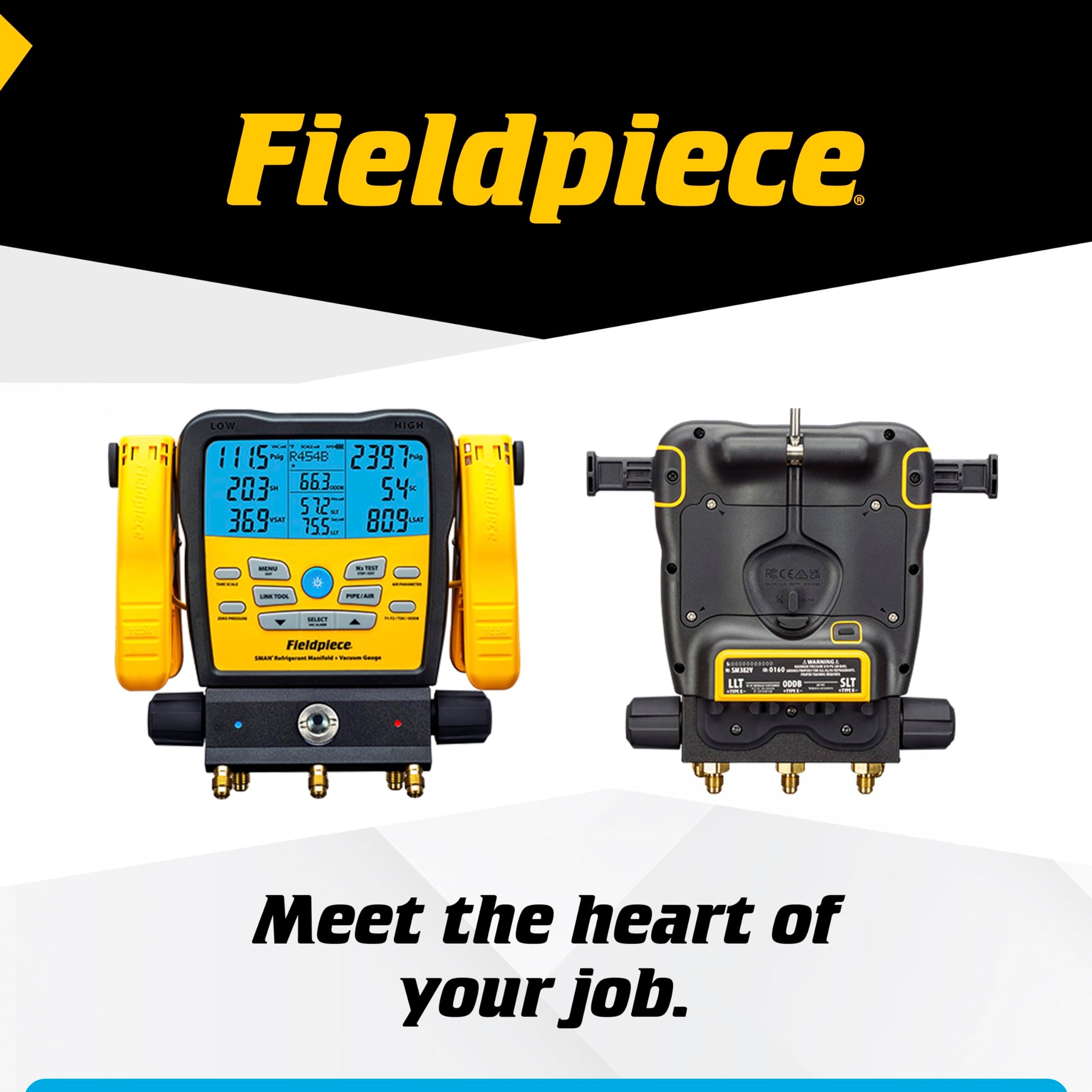 • Fieldpiece digital manifold gauges accurately measure low & high pressure, with superheat and subcooling